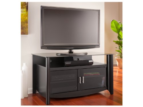 As sleek as the flat-screen TVs it displays, the Aero Collection TV stand is a modern statement. The TV stand accommodates flat-panel TVs up to 46-inch or 117-pound. It features a gray tinted top glass shelf, plus room for audio components or a sound bar. Wire management ties and pass-through slots help keep cables hidden yet accessible when they need to be. Compatible with the StabiliBar TV Safety Brace. Matches with other Aero Collection pieces, including the Aero End Tables, Coffee Table and