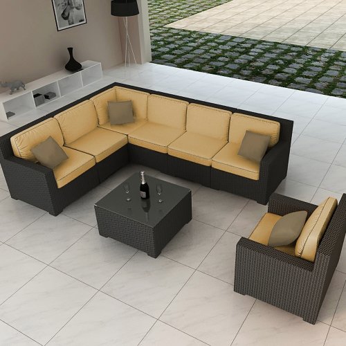 The Forever Patio Hampton 8 Piece Modern Patio Sectional Set with Golden Sunbrella Cushions (SKU FP-HAM-8SEC-CH-WM) is sure to be the center of your next outdoor get-together. The set seats 6 to 7 adults comfortably, and features Chocolate resin wicker, which is made from High-Density Polyethylene (HDPE) for outdoor use. Each strand of this outdoor wicker is infused with the rich color and UV-inhibitors that prevent cracking, chipping and fading ordinarily caused by sunlight, surpassing the qual