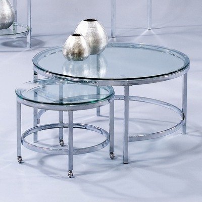 Versatile function never looked this good! Pair of contemporary cocktail nesting tables enables endless design options for your surroundings. Smaller table has wheeled base for go-anywhere mobility. Each table has glass tops & chrome plated legs. Patinoire collection. Patinoire Collection. Nested roll-out table on casters included. Chrome plated. Polished bull-nose glass tops. 34 in. Dia. x 18 in. H (43 lbs.)