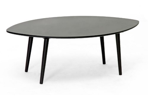 Griffith Modern Coffee Table by Wholesale Interiors One of our favorite coffee table options, the Griffith Coffee Table is a versatile piece. The wooden living room table is designed with a noticeable influence from the mid-1900s with its irregular shape and engineered wood form. The table is finished with basswood veneer and solid rubberwood legs, all of which are stained in Wenge (dark brown) so deep that it appears Black in most lighting conditions. Because the wood grain of the basswoo