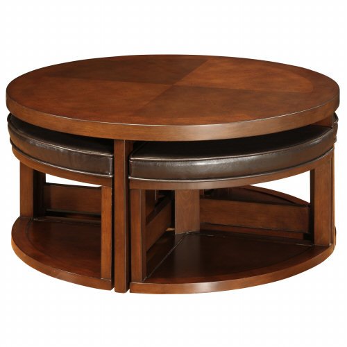 What is included:Cocktail Table (1) Extra seating is never a problem with the functional Brussel II Collection. The 4 stools tuck neatly under the cocktail table when not in use. The geometric circular design and warm brown cherry finish will be a perfect addition to any home d