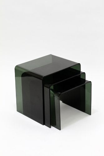The Casper nesting tables are made of rounded sheets of acrylic, giving a clean see-through look to the 3 piece set. Perfect for a small living room, this space saving design lets you entertain many and keep your space clear afterwards. This item is a high quality reproduction of the original. Small: 13"D x 13.75"W x 12"H Medium: 13"D x 15"W x 14"H Large: 13"D x 16"W x 16"H 3/16" Thick Ships small carrier