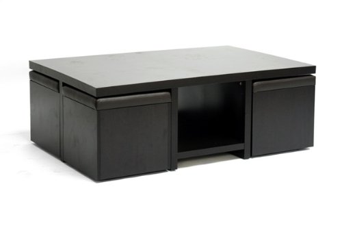 Perfect for casual entertaining or an impromptu cocktail party, the Prescott Table and Stool Set is contemporary and convenient. A space-saving coffee table or cocktail lounge furniture set, you will be delighted by the bevy of features: four cube ottomans/stools with removable lids and internal storage compartments and caster wheels, rich dark brown wood effect paper veneer over a lapped chipboard frame, and a shelf underneath the tabletop. Each stool comes with a dark brown faux leather lid. T