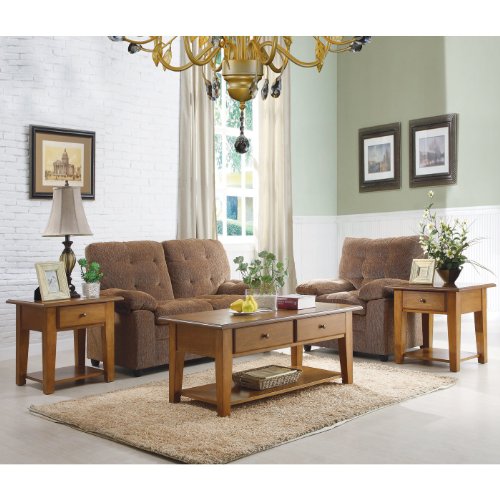 3231-31 Features: -Clean design, simple embellishments.-Antiqued bronze hardware.-Grooves define lend a simple decorative element.-Drawer and display shelving. Includes: -Set includes 1 cocktail table and 2 end tables. Color/Finish: -Warm Brown finish.