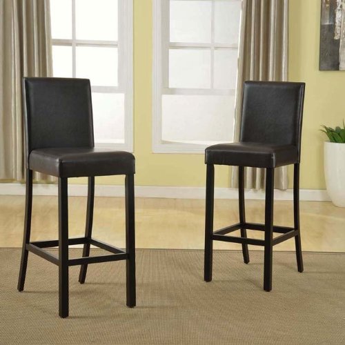 Torino Modern Counter Stools - Set of 2. The Torino Modern Counter Stool is packed with value, style, and convenience. This versatile little number features a simple design and neutral dark brown faux leather to complement your decor. A birch frame includes a foam-padded seat, black lacquer finish, and non-marking feet. The stool is made in Malaysia, requires assembly. To clean, wipe with a damp cloth. Dimensions: 38.5"H x 16"W x 20"L; 13 lbs. Seat - 25"H x 16"W x 16"D